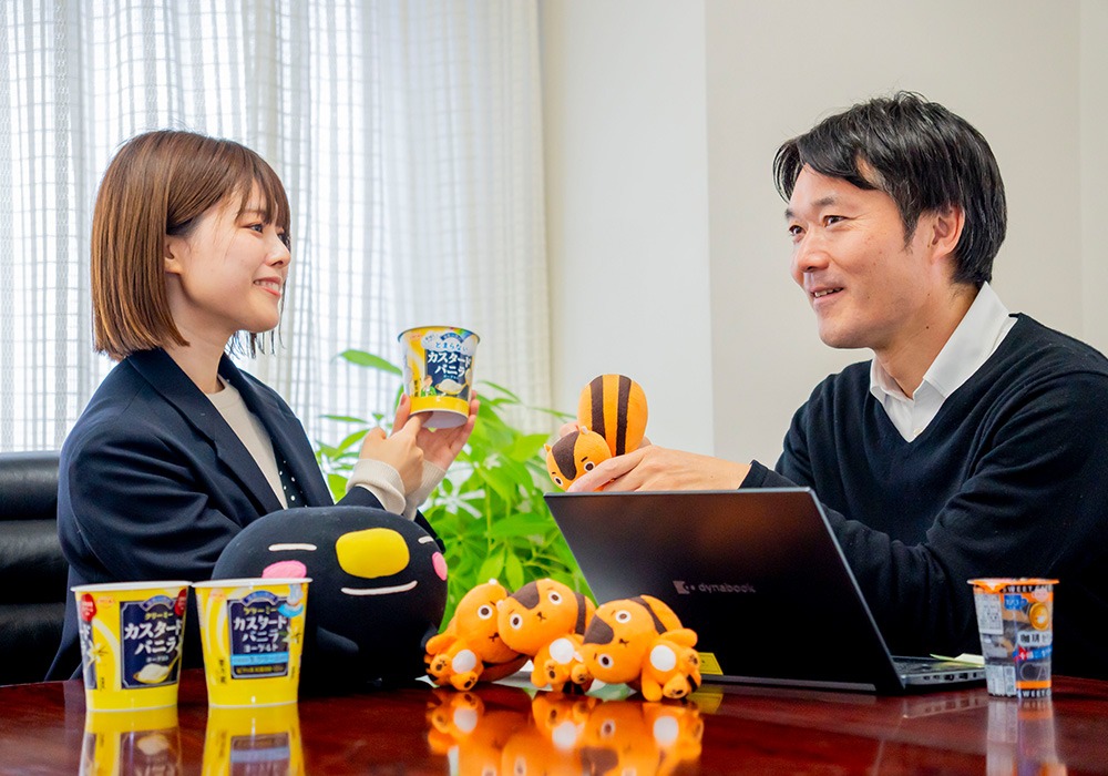 例えば、リニューアルで担当した「カスタードバニラヨーグルト」では、SNSのコメントやアンケート、消費者様インタビューといった、様々な方法でリアルな声を集めました。お客様から寄せられた「酸味がやわらかくて食べやすい」「何度も食べたくなる」というお声が、社内で感じていた強みとも一致していて「ちゃんと伝わっているんだ」と嬉しくなりましたね。そこから、パッケージにお客様の声を反映させるなどの施策を行い、実際に売れ行きや購入層の変化にもつながりました。